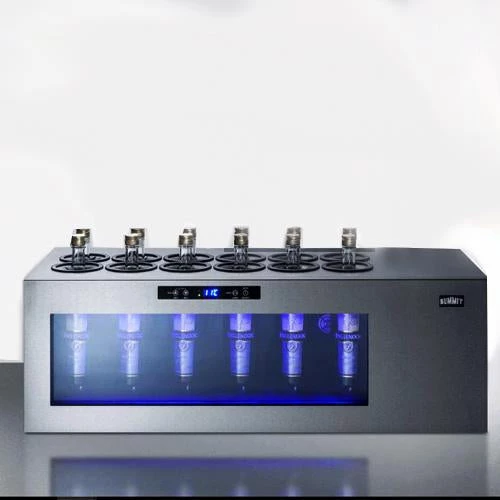 Twelve bottle countertop wine chiller with soft blue LED lighting adjust from three levels of brightness to best suit your setting. The compressor-based refrigeration cooling system ensures fast temperature pull-down ideal for use in bars, tasting rooms, and restaurants. Twelve slots let you store standard Bordeaux wine bottles in an upright position, with a tinted glass window that offers an attractive, illuminated display of the bottles’ labels. Digital controls for easy temperature management. Temperature can be set between 41 and 68ยบF. ETL-S listed to NSF-12 commercial standards for use in foodservice settings. Easy user maintenance with an auto defrosting system, with control panel setting included for defrosting if the cooler is used in areas of high heat or humidity. Ask for our freight quote. Measures: 12.5″ H x 35.75″ W x 15.38″ D