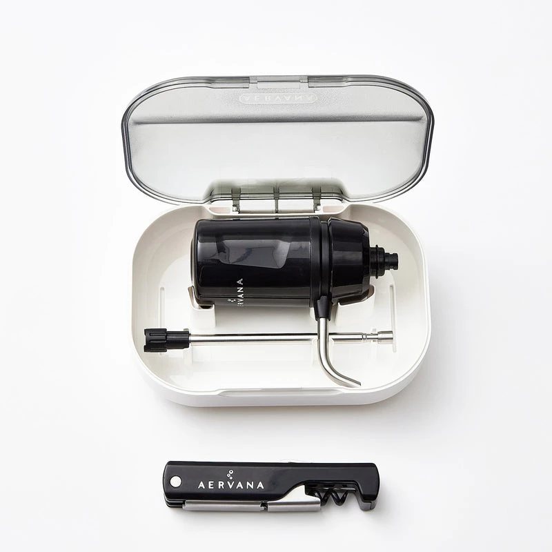 Aervana’s first one-touch travel wine aerator designed specifically for the on-the-go wine lovers. Provides the same amazing instant aeration for wines that need to breathe, in a compact, portable design.ย Just press the button on top to dispense a smoother, more balanced glass of wine. The Aervana Travel comes in a convenient carrying case to fit perfectly in a purse, picnic basket, or carry-on bag. In the carrying case youโll find the one-touch wine aerator and a matching corkscrew so you can enjoy your wine anytime and anywhere. Aervana Travel is your friend no matter where wine takes you. And it all comes in a convenient carrying case keeping the Aervana Travel, tube, and corkscrew neat and safe no matter how youโll be transporting it.