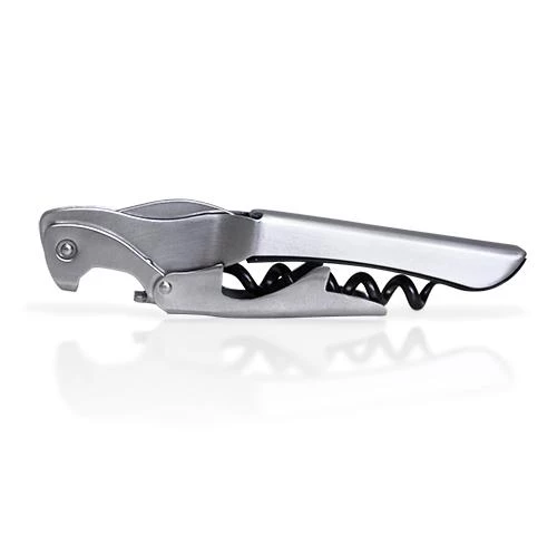 This elegant, professional-quality Stainless Steel Teflon Double Lever Corkscrew features a double-lever boot system which easily removes the cork from the bottle in two easy steps. This wine cork screw is built with top-quality, sleek, brushed stainless steel and a hard plastic undercarriage under the ergonomic grip that also protects the “worm.” The 2.5” long non-stick Teflon-coated spiral inserts easily to corks for fast removal. And, of course, no professional wine opener would be complete without including a serrated foil cutter.