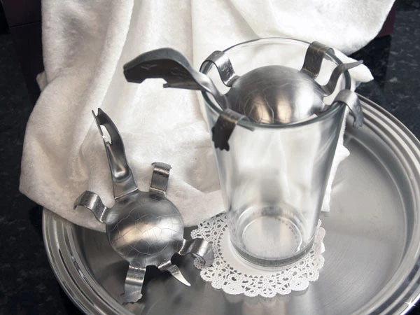 The Black & Tan Turtle is the perfect tool for making layered beers such as the Black & Tan, Patriot, Snakebite, Blacksmith, or Black Velvet. Shaped like a Loggerhead turtle, just rest the turtle over your half filled glass, and the convex (shell) directs the fluids to the sides of the glass for a perfect layer, free of mixture.