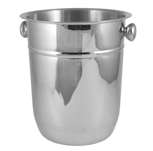 This reflective stainless steel champagne bucket is chrome plated for beautiful drink presentation, whether at home or in a restaurant setting. The three legged stand and bucket are available together or sold separately. Holds eight quarts.