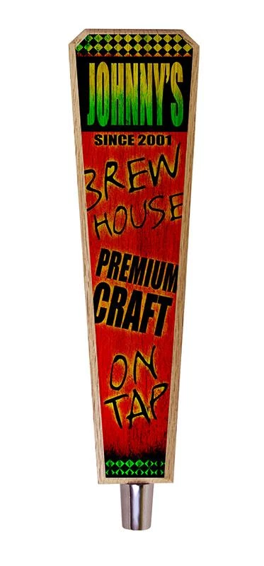 This colorful โBrew Houseโ template design is a fun, loud way to show off your signature crafts. Its grungy design is perfect for any man cave, bar, pub or rec room. It is uniquely customizable to display your Name (at the top) as well as a personal establishment date (est). This cool, modern design blends perfectly with the natural wood grains of the oak, making this beer tap handle ideal for any draft dispensing needs.