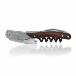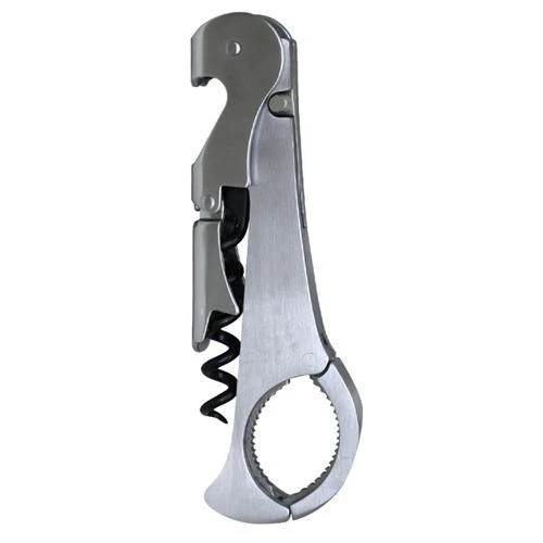 Sleek and compact, this corkscrew has it all. This Brushed Stainless Double Lever with Champagne Gripper corkscrew made of high quality stainless steel features double lever boot system with knife, bottle opener and Champagne gripper.