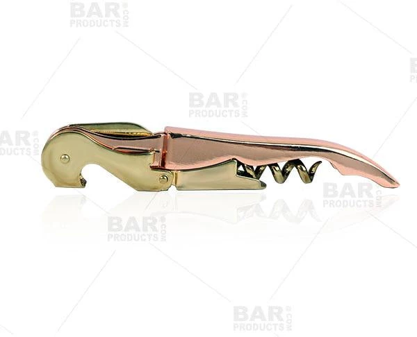 This double-lever corkscrew boasts a gold plated boot lever, screw and foil cutter as well as a copper plated handle. The double hinged lever allows for effortless cork removal from any bottle. This opener is durable and long lasting made with stainless steel and plated in copper and gold for added elegance and class. The design is sleek and streamline for easy storage and handling. This particular corkscrew also provides a variety of functions; not only is its main purpose to open wine bottles but it also includes a foil cutter and has the ability to open beer bottles. Also known as a waiter’s corkscrew, that tool may be small but it is essential to bartenders and waiters in any club or bar setting.