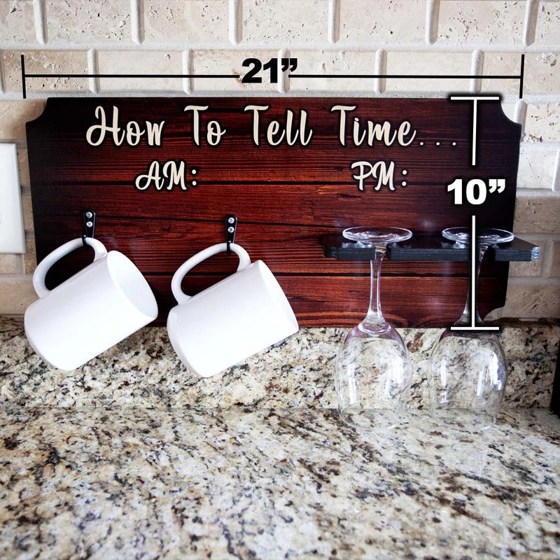 Crafted out of high-quality birch plywood, our “How To Tell Time” Mug and Wine Glass Holder is a charming and humorous way to store your mugs and wine glasses, convenient and ready to help kickstart your morning or wind down your evening! This rustic wood sign rack holds 2 mugs and 2 wine glasses and comes ready to hang with hardware pre-installed.