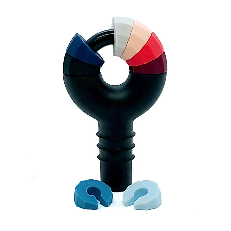 This silicone bottle stopper featuring 8 wine charms will be a great accessory to your wine service needs. The bottle stopper itself stores 8 color-coded wine charms that are designed to securely latch onto any stem of wine glass. Assign your guests a color and prevent any glass mix ups!