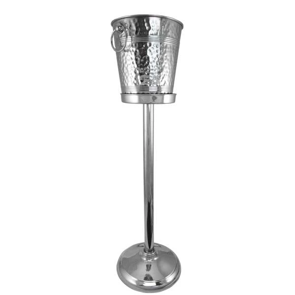 Lift your tableside wine and champagne service to a new level with this Hammered Ice Bucket. Our exclusive Hammered Bucket is an elegant essential and will bring a unique touch to your table and bar. Made of stainless steel with stunning hammered detail, rolled edges, and its convenient carrying handles provide easy transport. Stand sold separately.