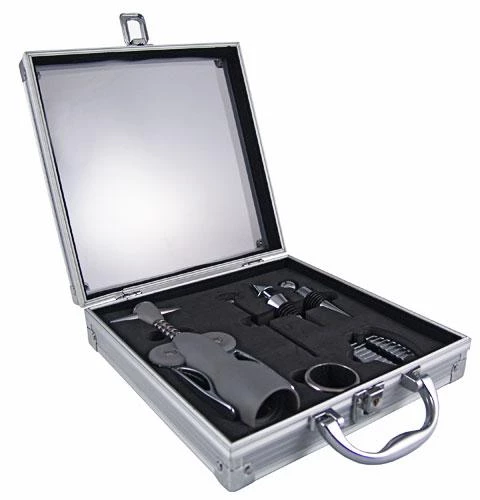 A modern alternative to the classic wooden wine set boxes, this metallic wine set is tough on the outside and soft and secure inside. A clear viewing top enhances its display quality. Included in this Platinum Set is a large winged corkscrew, drip ring, two chrome wine stoppers, foil cutter, and a wine thermometer. Dimensions: 9 x 9 x 2.5 inches.